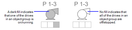 A dark fill indicates the run status of a drive is 'on' or 'running'. A white fill indicates the drive is 'off' or 'stopped'.