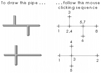 Use the Pipe tool to draw complex pipe arrangements (including 'T' pieces and junctions). The illustration below shows some pipes, and the sequence of mouse clicks needed to draw each of them: