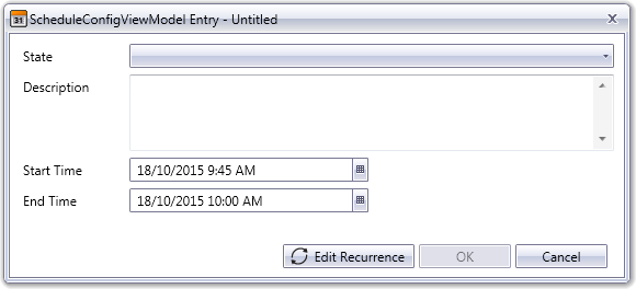 Schedule entries are used to specify a change of state for a selected piece of equipment. A schedule entry specifies a Start Time and End Time for a particular State.