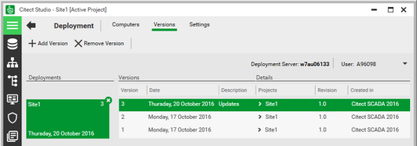 To deploy a Citect SCADA project, you need to add a version of the project to the deployment server (see Versions).