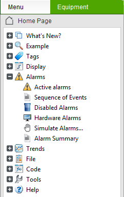 Viewing alarm pages at runtime varies according to the templates used to create the alarm pages. For example, if your project uses the StruxureWare templates the Alarm pages are automatically included in the runtime system available from the list of alarm pages in the Menu panel.