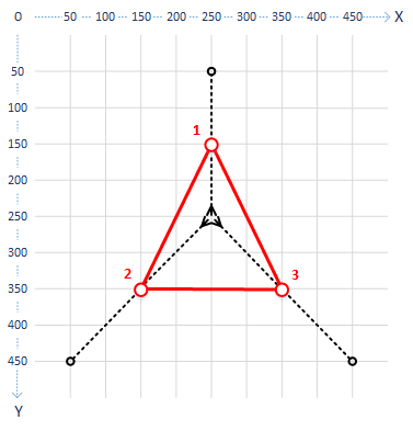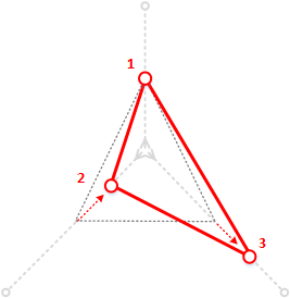 The following diagram shows the triangle with the path defined for each vertex by its offset values. In each case, the defined path starts at the center of the triangle and extends outwards.