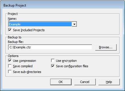 Enter the path to the backup file location, including the file name. You can either type the path in directly or use the Browse button. The backup file name defaults to <project>.ctz. If the extension is omitted then .ctz is used. |