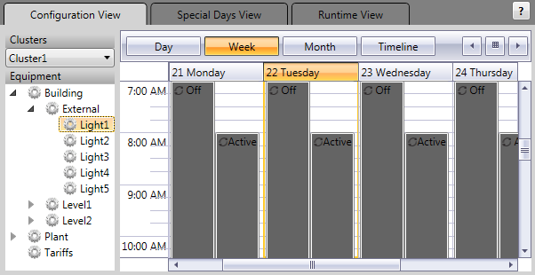 As with the Configuration View, the schedule is displayed as a series of blocks that indicate when each equipment state will start and finish. You can double-click on a block to view the properties for the schedule entry, but you will be unable to make any changes.
