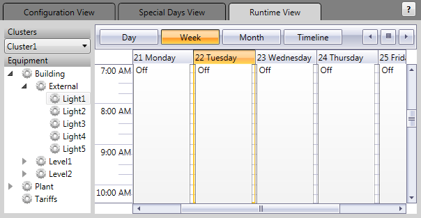 The Runtime View is a read-only view that displays the activity that will occur for a piece of equipment (with any conflicts resolved).
