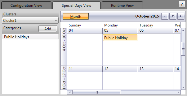 In this view, the calendar displays a month at a time. The equipment tree is replaced by a list of special day Categories. When you select a category, the associated special days are displayed on the calendar. Each is identified by a label that displays its Name.