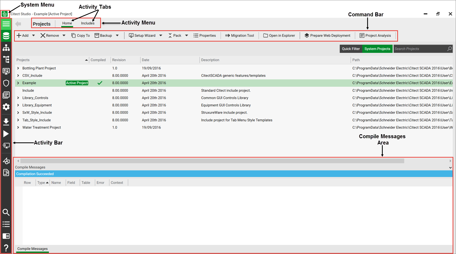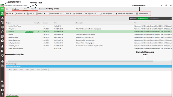 Citect Studio comprises an Activity Bar to allow for navigating between different activities as well as access to important global commands like Compile and Run. Within each activity, an Activity Menu allows you to configure different aspects of the activity through Activity Tabs. There may be multiple menus in an activity. Each Activity Menu displays a Command Bar with several options for performing specific tasks in that activity. Frequently used Command Bar options, such as Save and Discard, are available in more than one activity.
