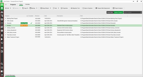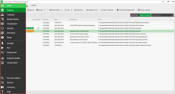The Activity Bar is located on the left hand side. It displays a set of icons that provide access to various project engineering activities such as Projects, Topology, Security, and so on.