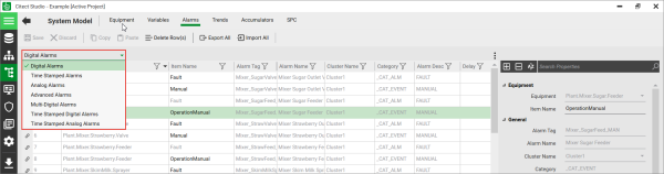 An Activity Menu tab may have a third-level of navigation displayed below the Command Bar. The third-level menu is displayed as a drop down list from which you can select an option. For example, System Model | Alarms displays the following menu, which can be used to select the type of alarm to configure.