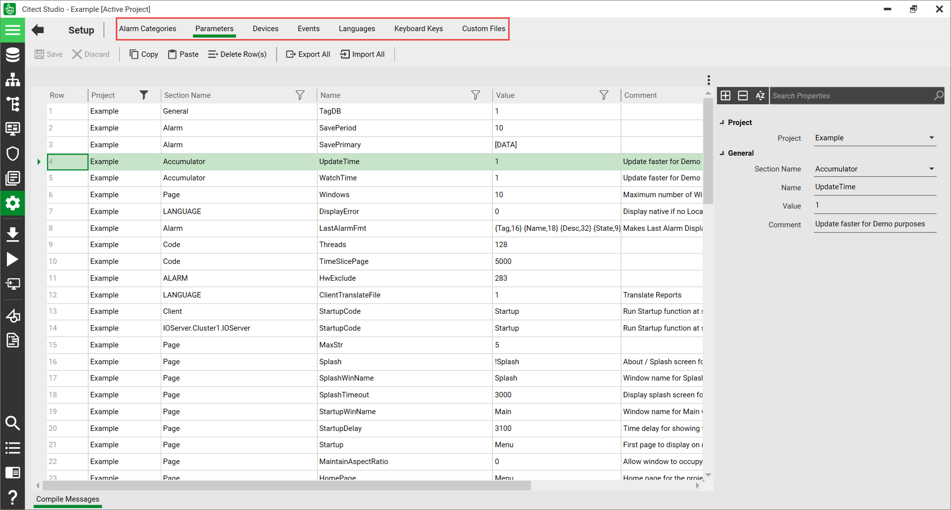 For example, when you select the Setup Activity Bar option, the Setup activity is displayed with an Activity Menu that has the Parameters tab selected, as shown below.