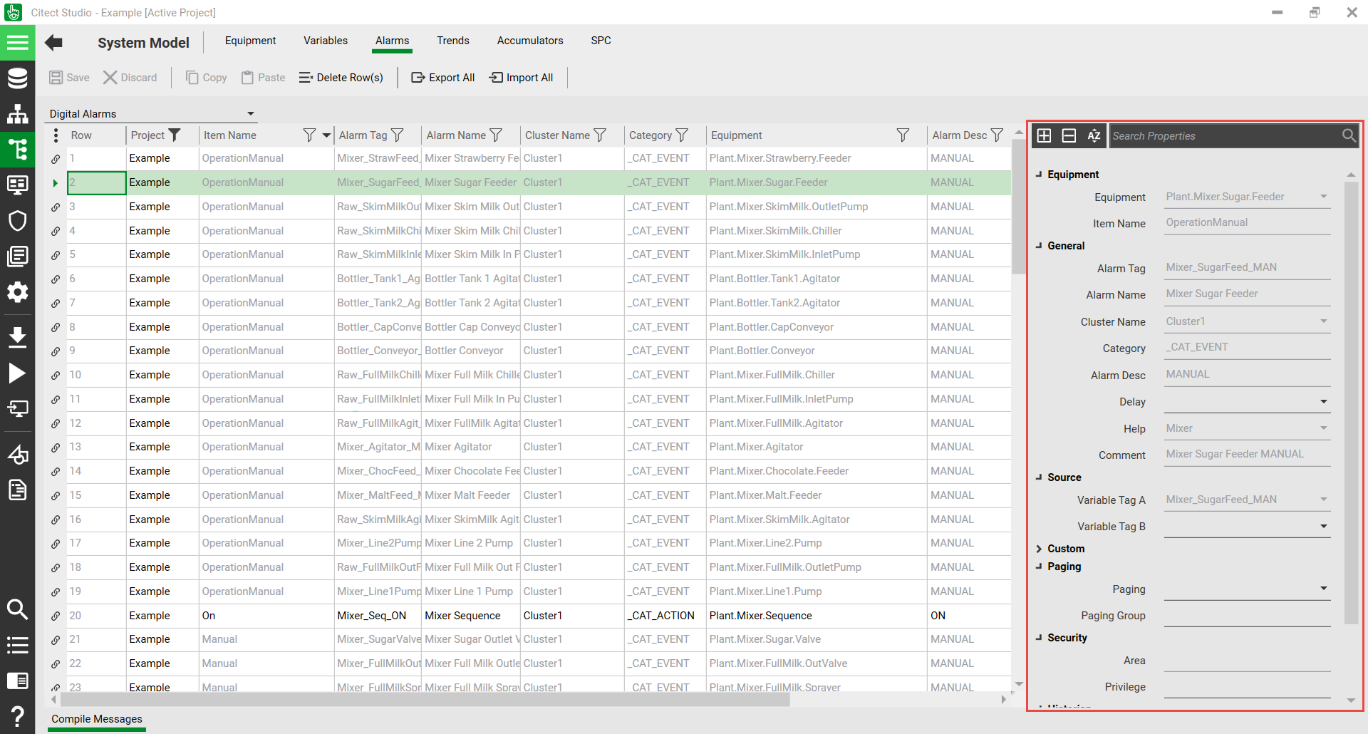 The Property Grid is displayed next to the Grid Editor on the right hand side. It displays details of the selected item. For example, if you have selected an alarm tag in the System Model activity, properties of the selected tag will be displayed in the Property Grid. As a default, properties of the selected item are displayed in categorized mode.