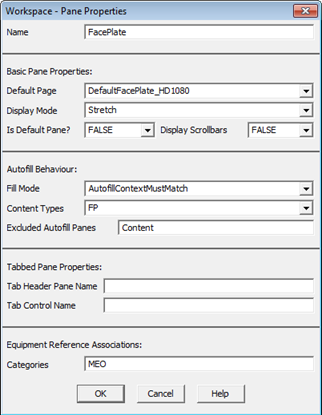 Note: If you have configured your own faceplate, verify the category entered in the Workspace pane properties dialog is the same entered when creating your references to related equipment.