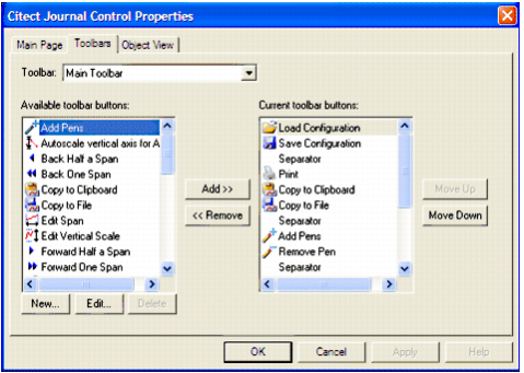 The Process Analyst has two toolbars, the main toolbar and the navigation toolbar. You use the Properties dialog box to configure the toolbars.