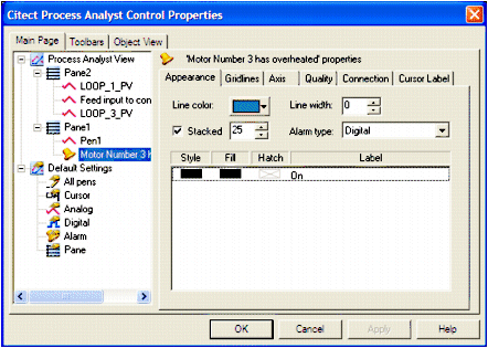 Configuring the appearance of alarm pens involves selecting the line color, stack property, line width, alarm type, and the properties for that alarm type.