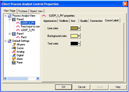 You use the Process Analyst Properties dialog box to configure the pen cursor labels. Configuring the pen cursor labels allows you to specify the color used for the lines, background, and text on the cursor label. The information shown on a cursor label is predefined and cannot be changed.