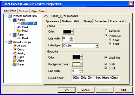 You use the Process Analyst Properties dialog box to configure the axis of the selected pen. A pen axis can be configured at run time by Operators, and at design time by Users.