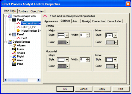 You use the Process Analyst Properties dialog box to configure the gridlines for a selected pen. Pen gridlines can be configured at run time by Operators, and at design time by Users.