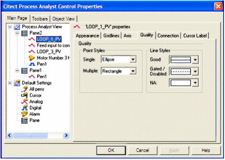Configuring the pen quality allows you to define the appearance of sample markers on a selected pen, as well as the line styles of the pen, based upon the quality of the data being trended by the Process Analyst.