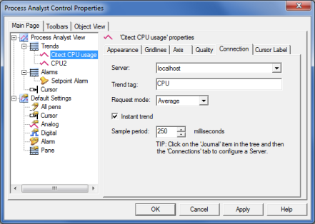 You use the Process Analyst Properties dialog box to configure the pen data connection. This allows you to define the server, trend tag, and request mode for the selected pen.