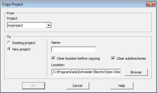 This field is only available if New project is selected. Use it to specify the directory where the copied project files will be stored. Use the Browse button to select a location. |