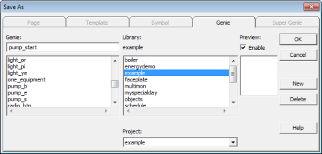 To create a new library for the Genie, click New. The New Library dialog will display. In the field provided, name the new library and click OK. The new library will be added to the library list. You can now paste the Genie on a graphics page.