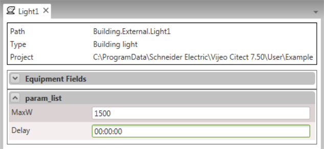 The Citect SCADA Example project includes an equipment type named "Building Light" that has two parameters defined: