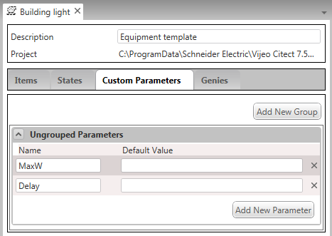 Custom parameters can be added to an equipment type to include information that is specific to an equipment instance and the equipment it represents (such as a set point or delay setting).