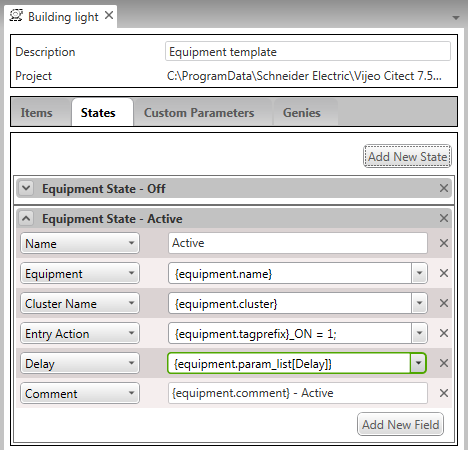 An equipment state called "Active" is also configured for the equipment type. It includes a field called Delay that references the Delay parameter.
