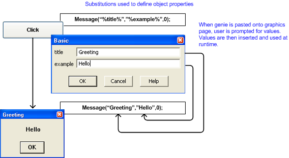 A Genie substitution can be a number or name you use to define an object's expression. Used as a placeholder the expression is replaced with a real value when you compile the project.