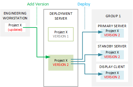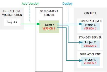 In the diagram below, Project X has been configured on an engineering workstation. A version of the project is added to the deployment server as "Version 1". The project's runtime files can then be deployed to the computers included in a group named "Group 1".