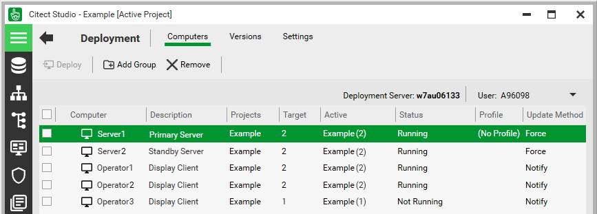 Note: If Citect Studio is not connected to a deployment server, you will not be able to access the Computers view. See Connect Citect Studio to a Deployment Server. You will also need to log in to the deployment server to access and operate this view. If you have not been assigned appropriate access, see Provide Deployment Access to Additional Users or contact your system administrator.