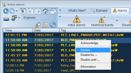 If an alarm does not appear to be operating as designed, or is determined to be unnecessary, an operator can disable it. A disabled alarms is ignored by the alarm system until it is returned to an enabled state (see Enable a Disabled Alarm).