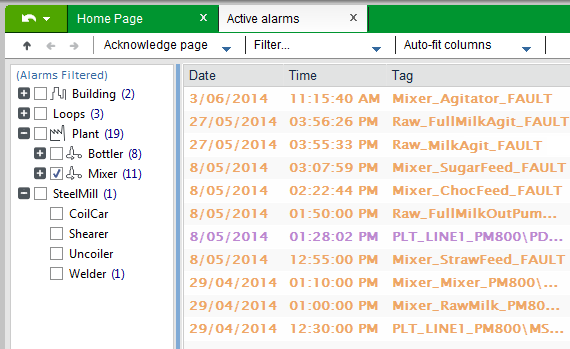 The integrated object model has been used to filter the alarms by placing a check mark next to the Mixer branch. This means the list only includes the 11 active alarms associated with the Mixer.