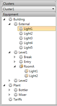 The equipment tree uses a set of icons to indicate the status of the items included in the equipment hierarchy. For example, the icon for "Building.Level1.RoomA" in the equipment tree shown above indicates that RoomA is currently in override mode.
