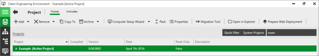 By default, all user projects created in Citect SCADA are displayed in the Project activity. The name of the active project is displayed title bar and also next to the project name.