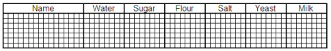 {Name,16}{Water,8}{Sugar,8}{Flour,8}{Salt,8}{Yeast,8}{Milk,8} |
