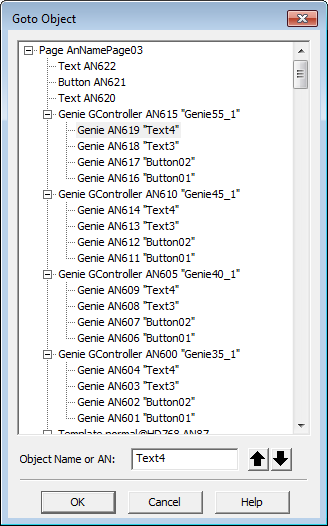 You use the Goto Object dialog box to find, select and access the properties of objects on your current page or on page templates used by the current page. You can select objects, Genies, symbols, and groups on the page (or template) as well as the graphical elements that make up those Genies, symbols, and groups.