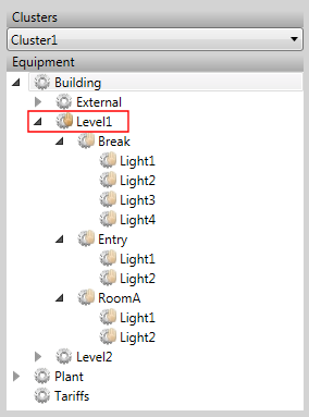 The override setting has propagated down the equipment hierarchy. This is indicated by the transparent icon located next to the equipment that branches off from Level1.