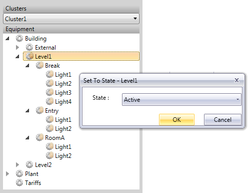 In the example below, the equipment state for Level1 is set to "Active" in the Scheduler equipment tree, which means every light on Level1 would turn on.