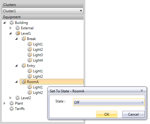 In the example below, a secondary override has been applied to "Building.Level1.RoomA" to counteract the Active state inherited override from Level1. This means the lights in RoomA can now be controlled independently and turned off.