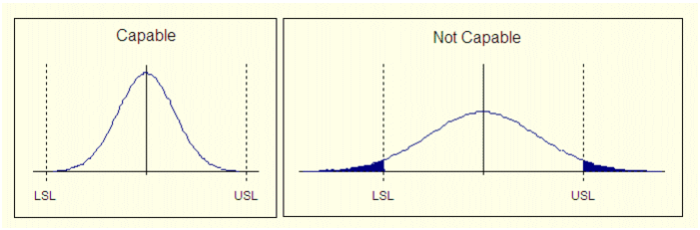 A process is said to be capable when the percentage of samples outside the specification limits is less than a predefined value. The following assumptions need to also be true: