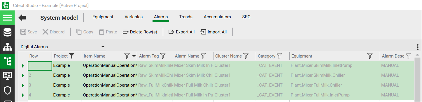 If any corresponding fields in the selected rows share common values, these values will appear in the Property Grid. For example, if you selected the four rows displayed above, "_CAT_EVENT" would appear in the Category field, and "Example" would appear in the Project field.