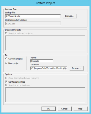 Select to restore all of the included projects that were added to the backup file. This will place a check mark next to each of the included projects listed in the panel below. Clear the Select all included projects check box to restore the project without any of its included projects. Or: In the panel displaying the list of included projects, select the check box for each included project you would like to restore. If you restore an included project that already exists, the existing project will be overwritten. If you restore an included project that does not already exist, it will be added as a new project to the same parent directory as the main project. Note: If the Select all included projects check box is disabled, it indicates that the backup file does not contain any included projects. |