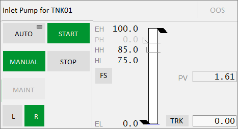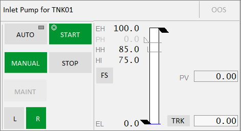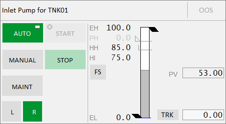 The CtrlModeDef tag sets the default mode of operation for a piece of equipment. If you set this tag to 0 for a pump, the default mode of a pump will be Auto. That is indicated on the faceplate by a rectangle in the top-right corner of the Auto button on the faceplate as shown below.