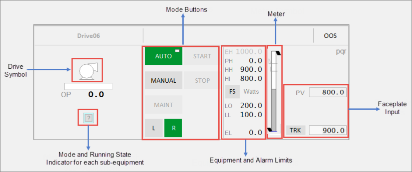 Symbol for the drive associated with the selected equipment. Clicking on the multiple equipment object selects that particular drive. The buttons, meter and readings are then populated for that drive. |