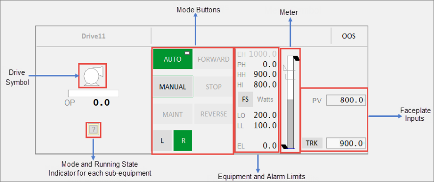 This faceplate is used for a customized VSD drive that has different commands for forward and reverse. This faceplate is similar to the VSD drive faceplate.