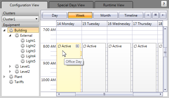 For example, the equipment hierarchy in the Citect SCADA Example project includes a top level entry named "Building". A recurring schedule entry named "Office Day" is configured at this level. It specifies an active state commencing at 8:00 AM every weekday.