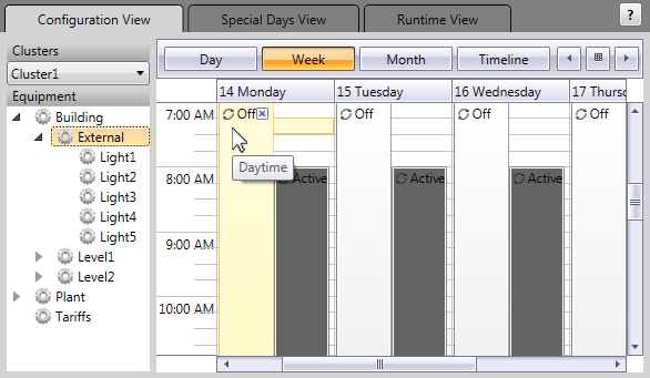If you move down one level in the equipment hierarchy to "External", you will see that the "Office Day" schedule still applies (an inherited schedule is highlighted using dark gray). The inherited schedule entries display alongside a recurring schedule configured at the External level named "Daytime".