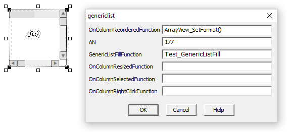 The Generic List Genie dialog box will include some additional parameters that enable runtime interaction with the header row. By default, the OnColumnReorderedFunction will display "ArrayView_SetFormat()". This is a system function that allows an operator to rearrange the header row columns at runtime.