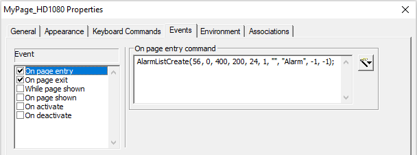 To add an alarm list Genie ("alarmlist" or "alarmlist_v") to a page: